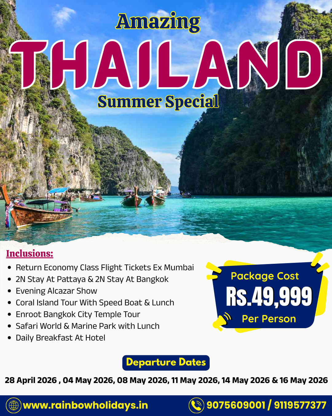 #ThailandTourPackage #ThailandTripFromPune #InternationalTourPackages #PuneTravelAgency #BestTravelDeals #BudgetInternationalTrip #RainbowHolidays #PattayaTour #BangkokTrip #SummerVacation2026 #TravelDealsIndia #HolidayPackages #TravelFromMumbai #VisaFreeTravel #ExploreThailand #TravelNowPayLater #FamilyVacationDeals #CoupleTripThailand #GoogleMyBusinessIndia #TopTravelAgencyPune