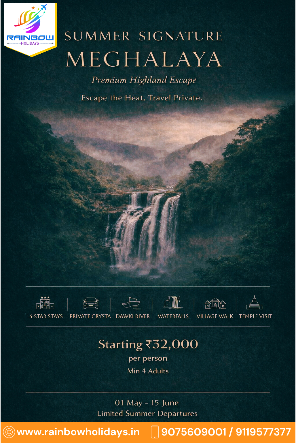 Rainbow Holidays brings you an exclusive Meghalaya Premium Highland Escape with private travel, luxury stays & breathtaking waterfalls!